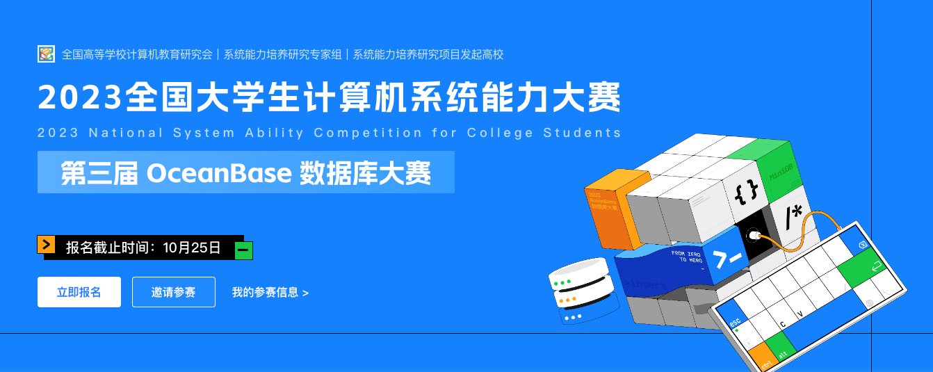 即日起,选手可通过全国大学生计算机系统能力大赛官网、OceanBase 社区官网报名,报名截止 2023 年 10 月 25 日。