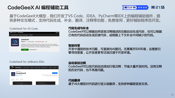代码生成模型完成之后,团队着手开发 IDE 插件,将模型应用到实际编程过程中。CodeGeeX 插件支持 VS Code 和 JetBrains 等主流 IDE。用户可以利用代码补全、生成注释等功能,也可以通过自然语言聊天提问。