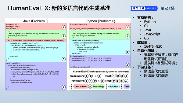 训练完成后,对模型进行评测与优化才能使其投入实际使用。由于之前针对多语言代码生成模型缺乏科学的评测基准,团队基于 HumanEval 构建了 HumanEval-X 评测基准,将其从只支持 Python 扩展到 C++、Java、JavaScript 和 Go 五种语言,可以更全面地评估模型的多语言生成能力。