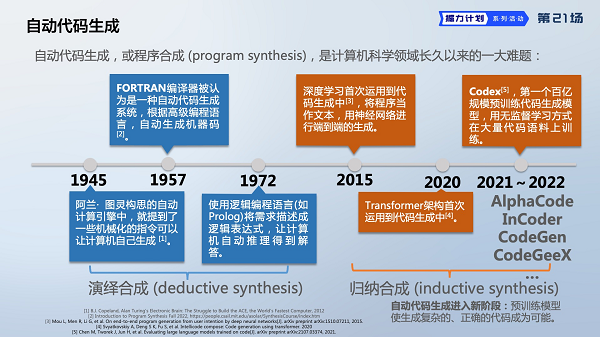 自动生成代码的想法随着人工智能技术的进步也在逐步实现。早期主要采用基于规则的方法,2015 年第一次有研究将深度学习应用于代码生成,取得了一定进展。2020 年,Transformer 架构不仅通过 GPT-3 模型展示它在自然语言生成方面的惊人能力,也开始被应用到了代码生成领域。2021 年,OpenAI 推出了规模达到百亿参数的 Codex 代码生成模型,使自动代码生成真正具备实用性。此后,业界纷纷推出自己的代码生成模型和编程助手产品。