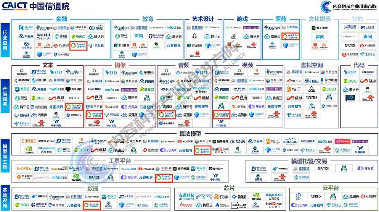 近日,亚信科技凭借 AIGC 智能内容生产平台 AISWare AI² GC 的技术先进性和方案创新性,成功入选中国信息通信研究院(简称「中国信通院」)发布的《2023 大模型和 AIGC 产业图谱》(简称「图谱」)中的「金融、医疗、文本、图像、视频、算法模型、工具平台」等板块,贯穿整个产业链上下游。