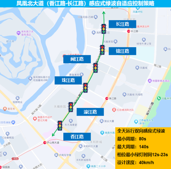 模型投入实战应用后效果显著。以红谷滩区凤凰北大道 (香江路-长江路) 为例, 路段全长 1.8km, 沿途共 6 个信号灯控路口, 流量波动性大。原先定周期协调方案消耗 1 人工一个月持续监测优化, 效果不能适应流量变化, 存在不定时性主路拥堵而支路空放的失衡问题。通过复用已建设的流量检测器, 数据赋能只需 1 人工 1 天时间配置感应式绿波自适应方案基础参数, 信号周期及各相位绿信比随着流量变化自动调整方案, 大幅提升效率并保障效果。