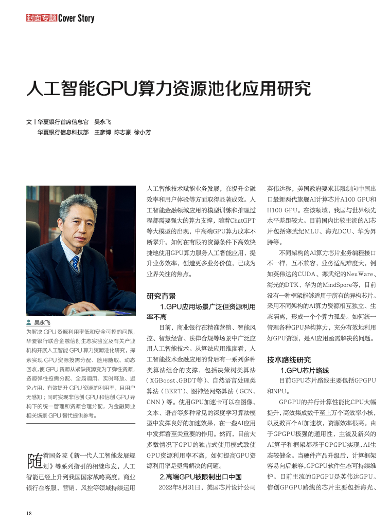 近日,由人民银行主管的期刊《金融电子化》刊登了一篇题为《人工智能 GPU 算力资源池化应用研究》的文章,由华夏银行首席信息官吴永飞、华夏银行信息科技部的王彦博、陈志豪和徐小芳合力撰写。文章聚焦于探索并研究人工智能 GPU 算力资源池化的创新方案,并提出如何统一管理各种 GPU 异构算力,充分有效地利用好 GPU 资源,是 AI 应用亟需解决的问题。