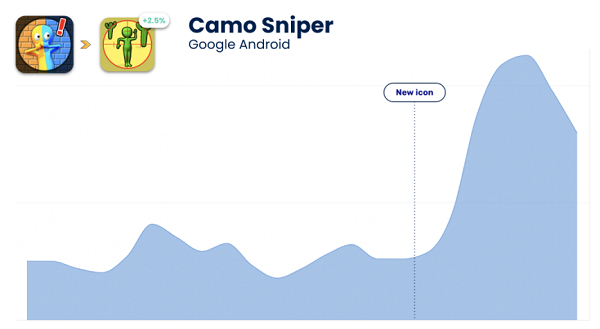 除此之外,更新图标还有助于转化新用户,吸引那些此前未在应用商店下载游戏的用户。新的图标能够再次吸引这些用户下载游戏。以《Camo Sniper》为例,该游戏在更新图标后,下载量增加了 180%。