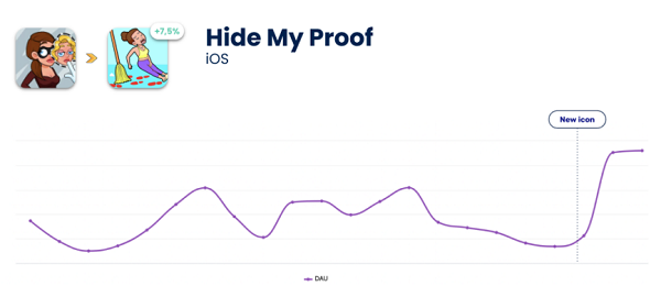 据统计,在美国,平均每个用户安装多达 8 款手游,因此持续更新图标的游戏更有可能在用户的手机屏幕上脱颖而出。例如,《Hide My Proof》在更新应用图标后,其日活跃用户数(DAU)增加了 7.5%。