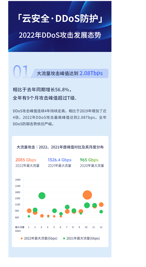 今年 2 月份,国内某大型云计算服务提供商基于全年平台观察、监测的数据,发布了「2022 年 DDoS 攻击发展态势」的报告,根据相关数据显示:100 Gbps 以上的大流量攻击自 2019 年起,截止到去年 2022 年,已经连续四年呈现出增长态势;尤其是 300 Gbps 以上的大流量攻击事件,相较于去年 2022 年,提升了 29.6%,「百 G 大流量攻击」近两年已然发展成为常态。
