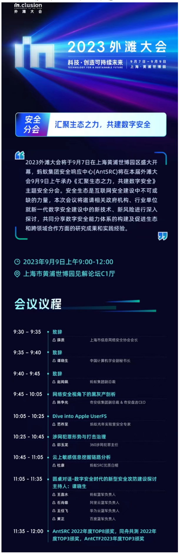 外滩大会期间,蚂蚁集团安全响应中心 (AntSRC) 将在 9 月 9 日举办“汇聚生态之力,共建数字安全”主题分会。届时将邀清相关政府机构、领军企业、行业专家等,就新一代数字安全建设中的新技术、新风险进行深入探讨交流,共同分享数字安全能力体系的构建,及促进生态与跨领域合作方面的研究成果、创新实践经验,共建网络安全行业优良发展环境,助力数字经济高质量可持续发展。