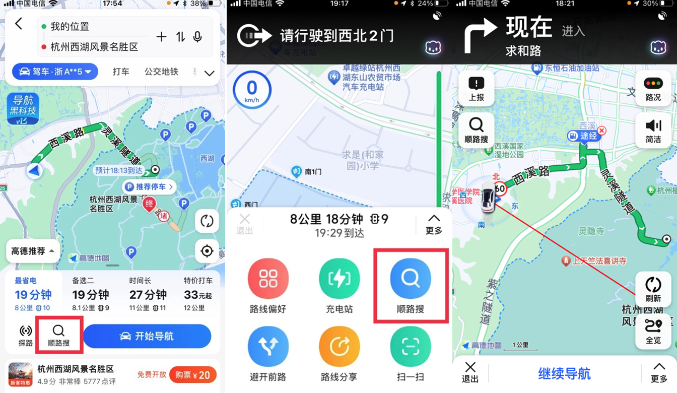 此外,还有可以帮助驾车用户「顺道办一切」的顺路搜服务,其背后基石即是高德地图主打的路线规划和实时交通等核心能力。驾车行前或行中,在起终点之间增加途径点这一变量之后,高德就可实时完成复杂运算,得出综合时间和空间维度的导航路线最优解,让下班回家顺道加油或购物的用户既不会饶太远,也不会耗费太多时间。