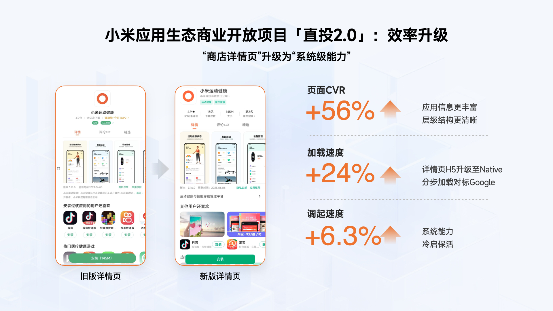 对于开发者/广告主而言,持续提升广告转化效率是收入增长的重要指标。考虑到转化链路、转化效率的重要性,小米应用商店将直投 2.0 的应用详情页从「依赖于小米应用商店客户端的普通 H5 形式」进化成了「MIUI 系统底层的 native 页面」,这一系统级的改变使「调用性能」得到了显著的优化,不仅加载速度提升了 24%,而且调起速度也提升了 6.3%。目前,直投 2.0 已正式全量上线开放,直击行业痛点,解决行业难题。
