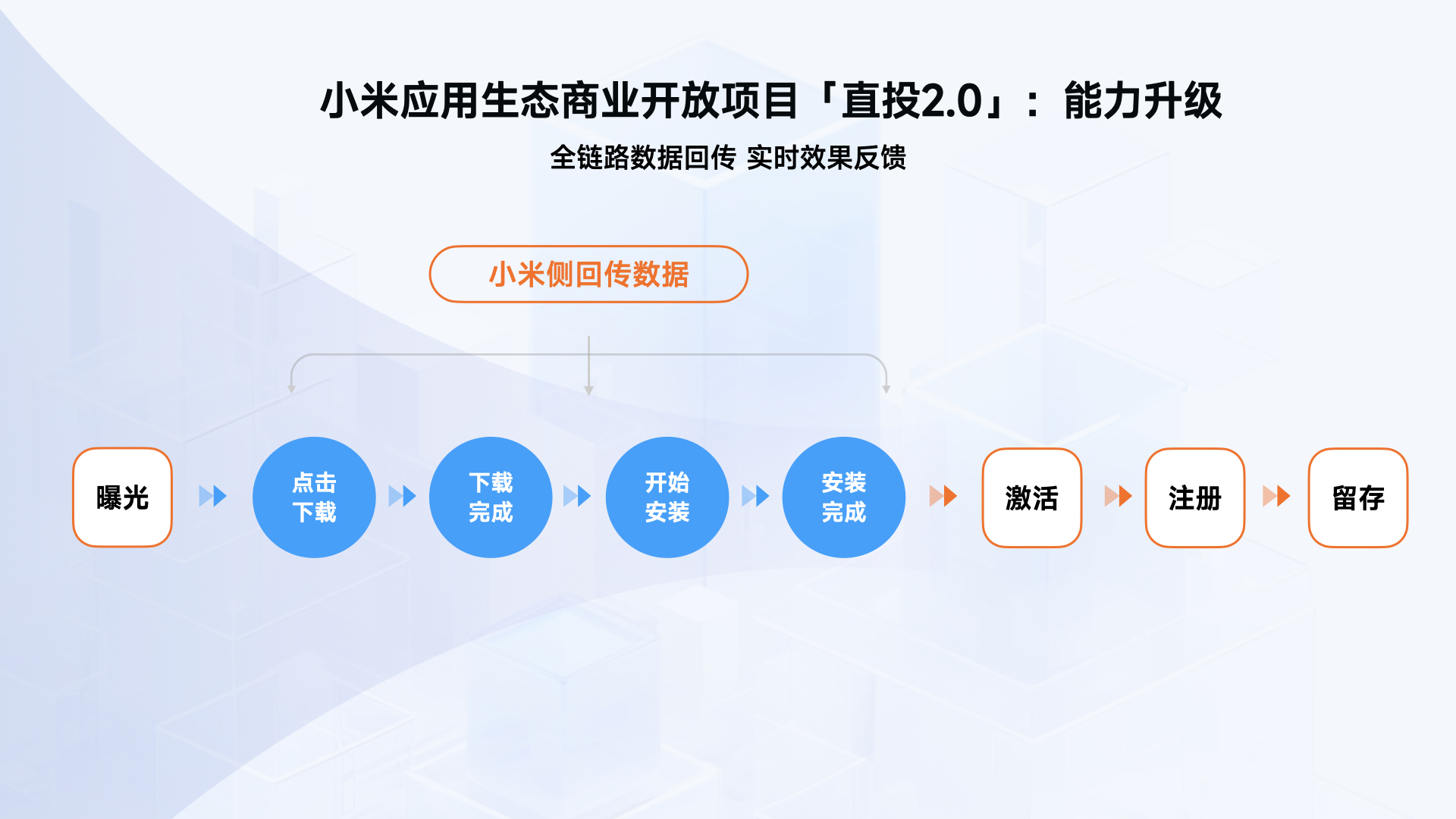直投 2.0 是小米平台推出的应用分发解决方案。当前,在安卓系统上,若不通过厂商官方应用商店安装应用,需要增加一步「安装器」的调起,用户要多次操作才能真正完成「安装-激活」的链路,体验感欠佳。针对这一现象,小米应用商店推出了直投 2.0 应用分发解决方案,一方面媒体分发应用时可直接调用小米官方提供的应用详情页,无需经过安装器即可完成下载安装,减少操作步骤;另一方面该功能也缩短了「下载-激活」的转化链路,极大提高了转化效率。