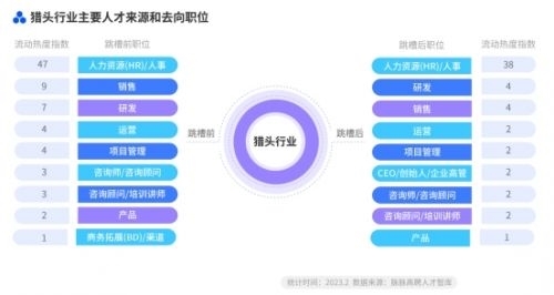 从业者流动趋势呈现专业化。猎头行业和企业数字化服务行业之间人才流动频繁。猎头从业者的职位来源 TOP5 分别是人力资源、销售、研发、运营以及项目管理。这些职位也是猎头从业者跳槽的主要去向。