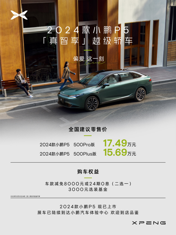 仅仅一周前,2024 款小鹏 G9 上市。最近,小鹏汽车再次推出新产品,正式上市的是 2024 款小鹏 P5。新车型提供 2 种配置选择,售价区间为 15.69-17.49 万元。