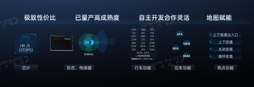 为了提供适合市场价格需求的智驾方案,四维图新推出了轻量版领航辅助驾驶系统 NOP Lite。在地平线征程 3 芯片的 5TOPS 算力下,四维图新 NOP Lite 能够实现行泊一体以及轻量版 NOP 功能。该方案以 5V5R 传感器配置,实现极简成本,为业内最具性价比方案。目前,四维图新已在业内率先实现基于地平线单征程 3 的行泊一体产品量产上车,为单征程 3 业内首发。依托强大工程能力,以极短的时间已成功助力客户产品落地。