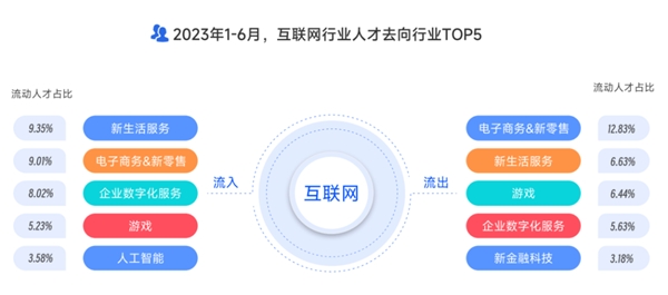 2023 年上半年, 互联网行业求职难度创新高, 人才供需比达到 2.34, 平均 5 个人才竞争 2 个岗位。互联网行业出现人才溢出现象, 人才流入流出比为 0.96。相比之下, 新能源汽车、新生物医药, 均呈现人才净流入状态, 其中, 新能源汽车行业人才流入流出比高达 1.66。