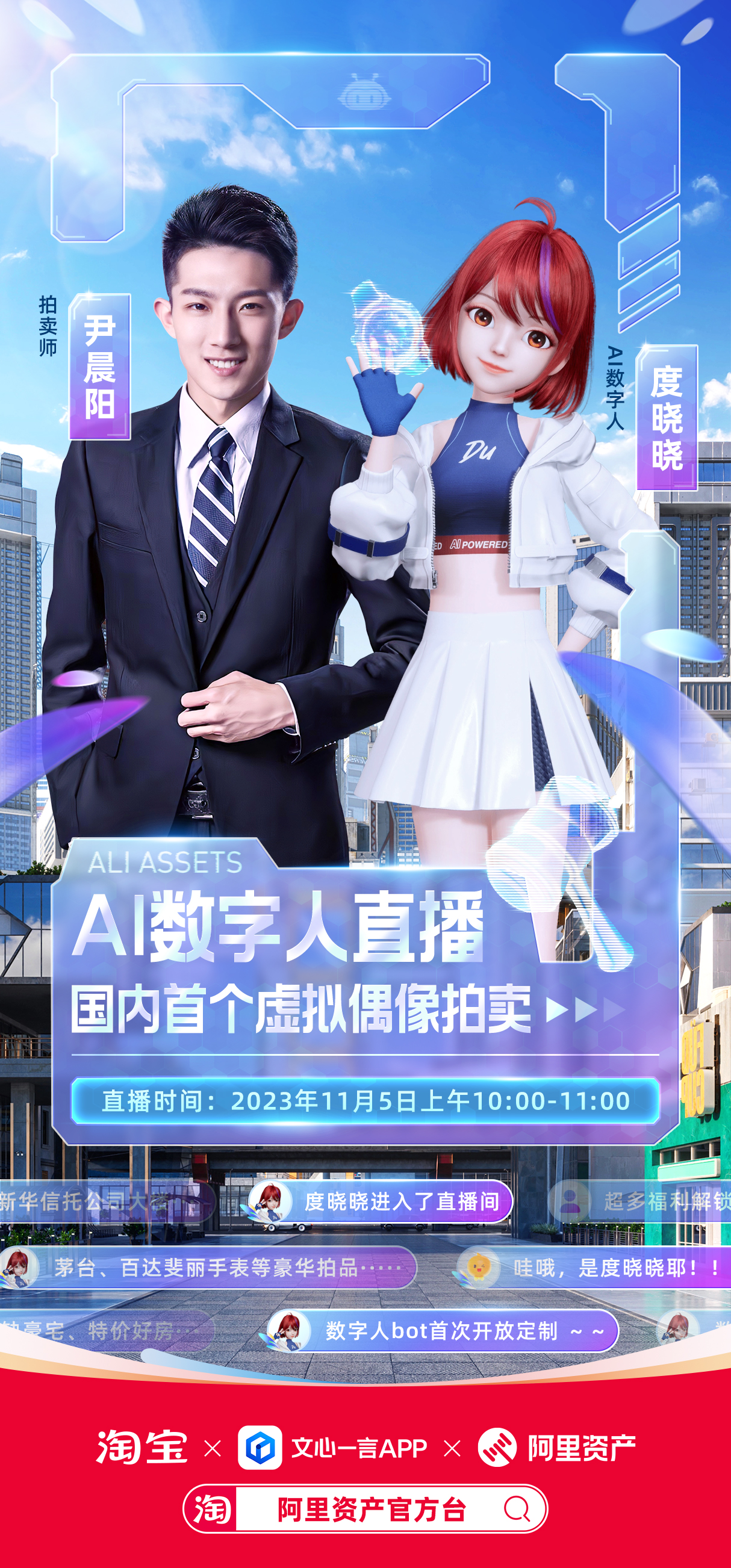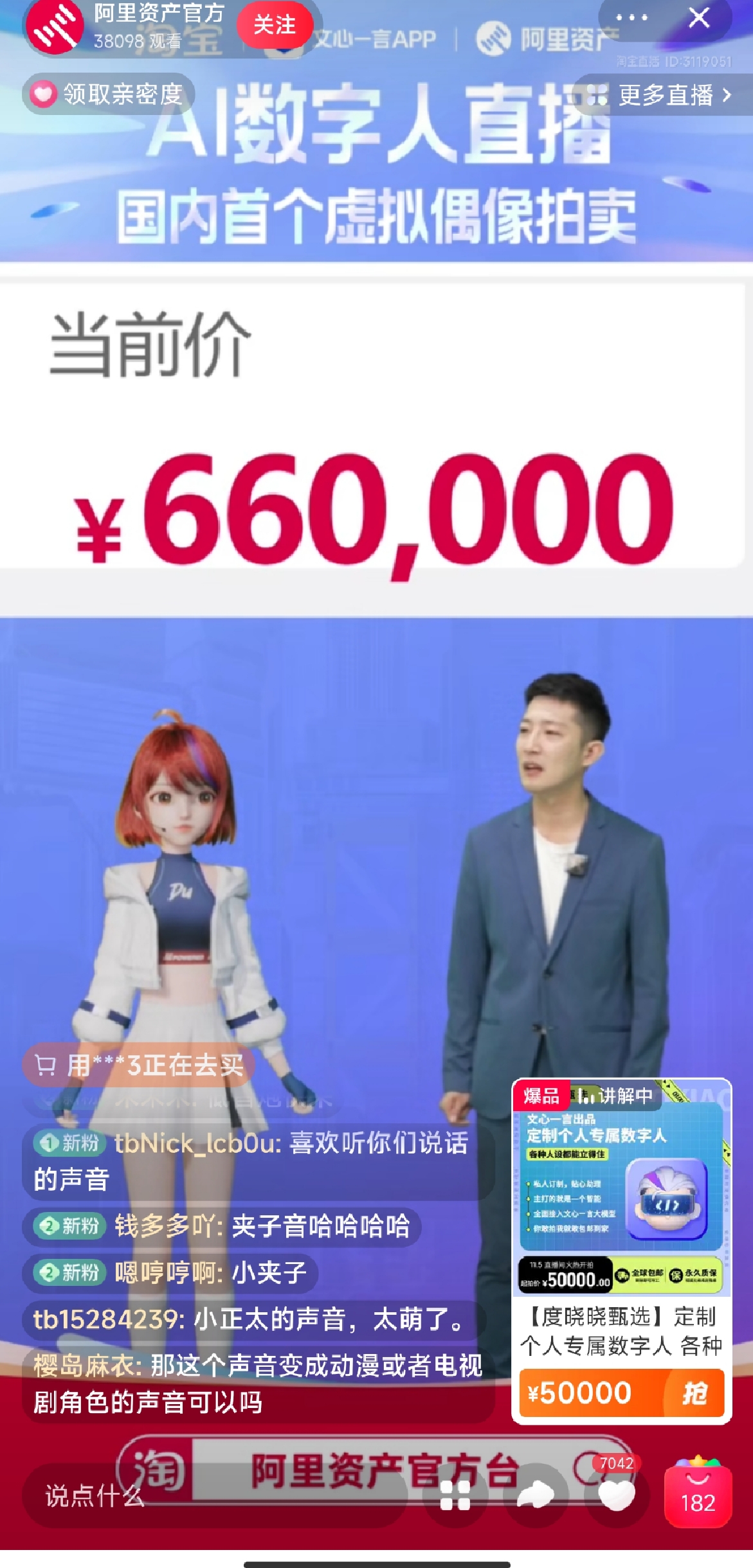 11 月 5 日上午 10 时,AI 数字人度晓晓与真人拍卖师尹晨阳一起,推出全网首次数字人拍卖。在阿里资产官方台淘宝直播间里,拍卖行业开启了新纪元。此次拍卖会上,除了高尔夫别墅、百达翡丽手表等重磅拍品之外,最令人瞩目的是度晓晓带来的「定制个人数字人服务」。经过 61 轮激烈加价,一位 95 后土豪最终出价 66 万元,带走了拍品,锁定数字人 bot 首次开放定制的独有权限。