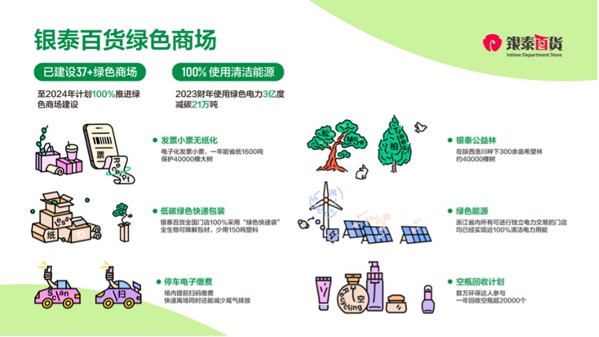 得益于数字技术,银泰百货已经实现了商场收银无纸化、发票小票电子化、场内营销在线化、会员卡券数字化。据阿里巴巴集团 ESG 报告显示,银泰百货 2023 财年减碳 21 万吨。多措并举下,银泰百货超半数门店获评「绿色商场」,武林银泰已经率先实现碳中和。