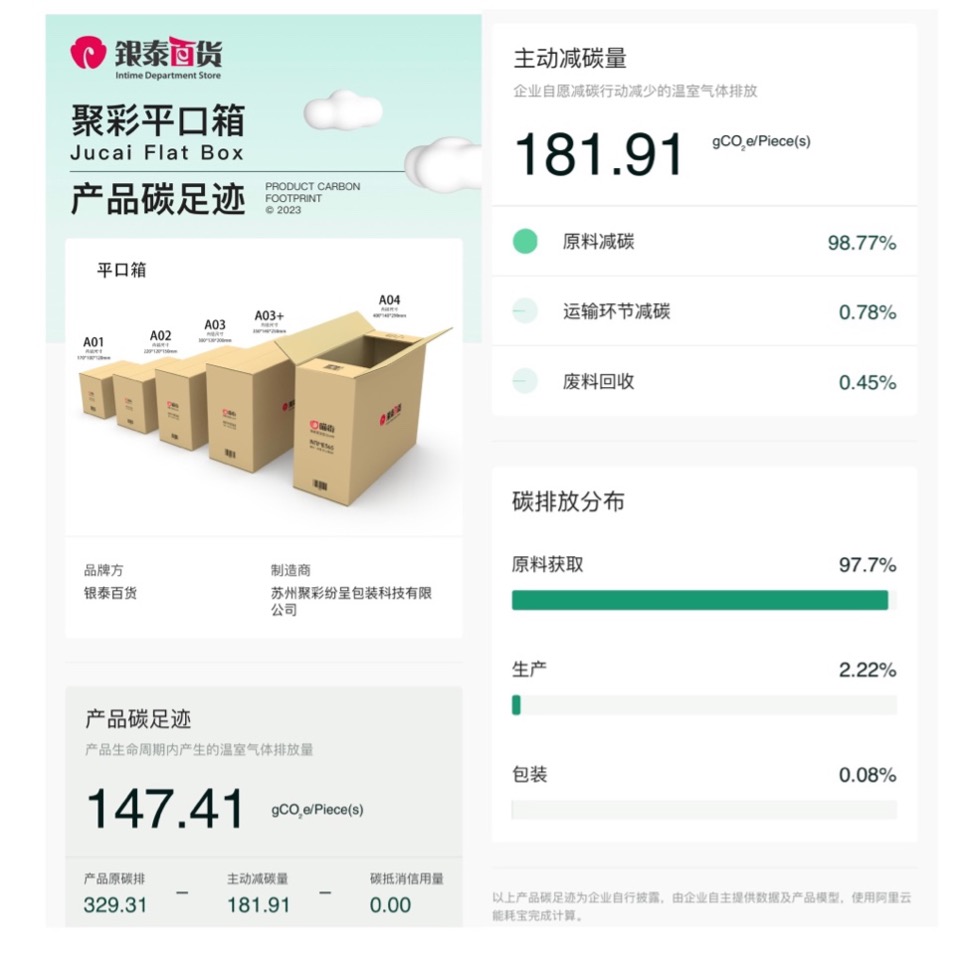 新升级的喵街「绿色包裹」由阿里云能耗宝完成了碳足迹核算。核算报告显示,从内部填充物到外部包材都采用环保设计和环保材料,由于生产过程中原料减碳、废料回收再利用等措施,每一个绿色纸箱对比同类产品累计主动减碳 181.91 克。
