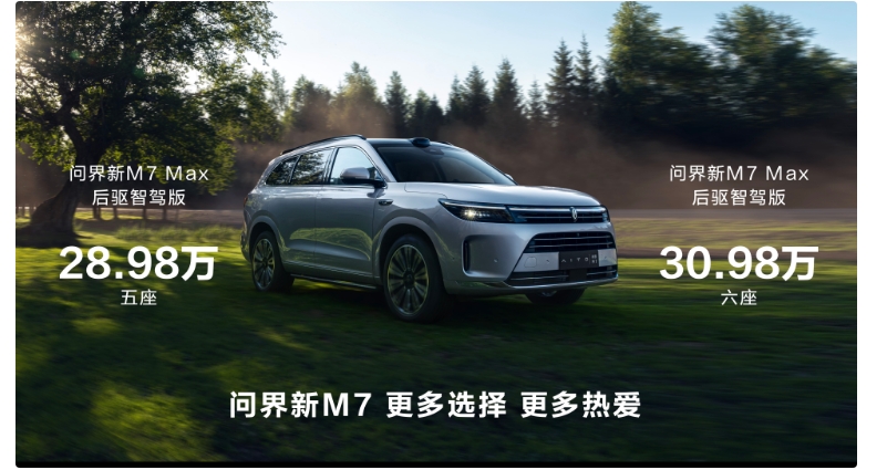 此外,为了回馈消费者的热爱,给出行提供更多选择空间,问界新 M7 还推出了后驱智驾版车型。其中,问界新 M7 MAX 五座后驱智驾版官方指导价 28.98 万元;问界新 M7 MAX 六座后驱智驾版官方指导价 30.98 万元;