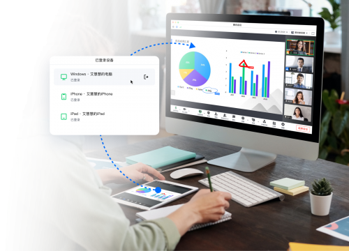 针对不少办公台式机缺乏摄像头和麦克风、又受制于企业管理无法外接硬件的问题,腾讯会议推出了多端入会功能,允许用户在电脑、手机、平板等各端同时入会:用电脑查看共享资料,用手机充当灵活的摄像头与麦克风,并在平板上进行批注,打造更自然、灵活、便捷的虚拟会议体验。