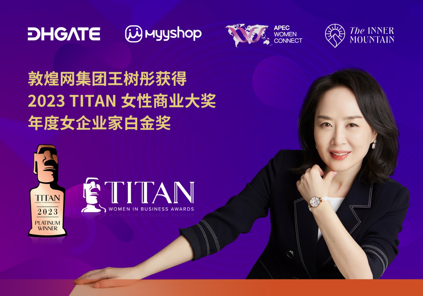 近日,2023 年 TITAN 女性商业大奖 (2023 TITAN Women in Business Awards) 悬念揭晓,敦煌网集团创始人兼董事长王树彤凭借 30 年来在商业领导方面的卓越贡献, 以及通过数字化支持创业、赋能女性成长方面的突破性成就,获得 2023 TITAN 女性商业大奖年度女企业家白金奖。