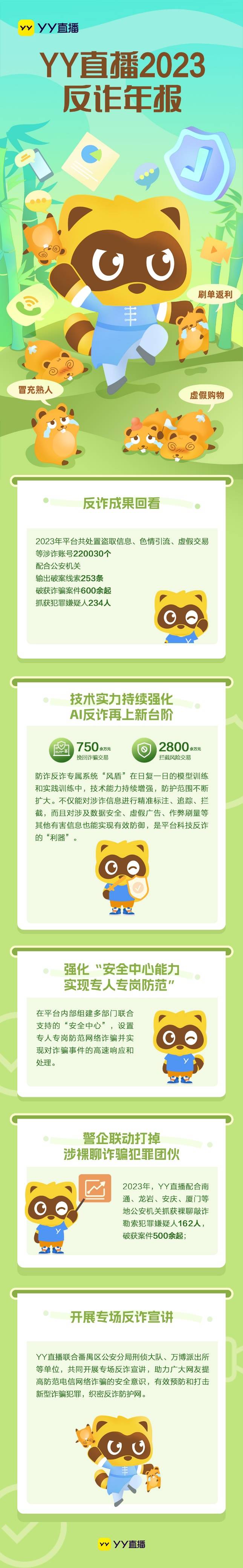 12 月 29 日,YY 直播发布《2023 反诈年报》,披露全年反诈工作成绩及进展。报告显示,2023 年 YY 直播共处置盗取信息、色情引流、虚假交易等涉诈账号 220030 个,向公安机关输出诈骗类案件破案线索 253 条,协助公安机关破获诈骗案件 600 余起,抓获犯罪嫌疑人 234 人。近年来,YY 直播从增强科技反诈实力、持续投入平台资源、强化警企联动三个主要方向入手,实现对涉诈信息精准拦截,对涉诈事件快速处置,对涉诈团伙精准打击,平台防诈反诈工作取得显著成果。