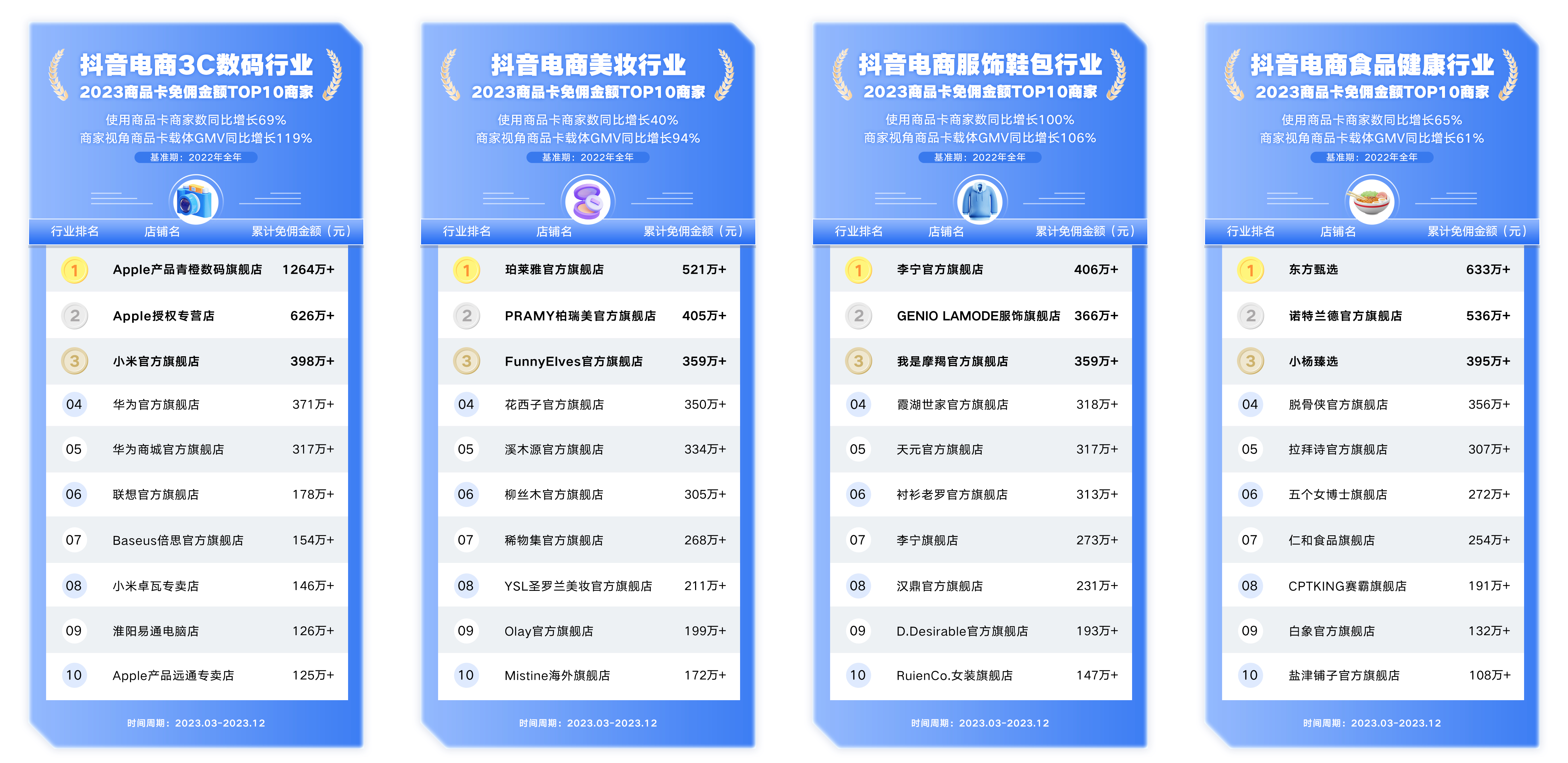 年终之际,抖音电商聚焦 3C 数码、美妆、服饰鞋包、食品健康、亲子生活、个护家清、珠宝潮奢、家居家电等多个行业,复盘商品卡免佣成绩,筛选出各行业商品卡免佣金额 TOP10 商家,树立经营标杆。