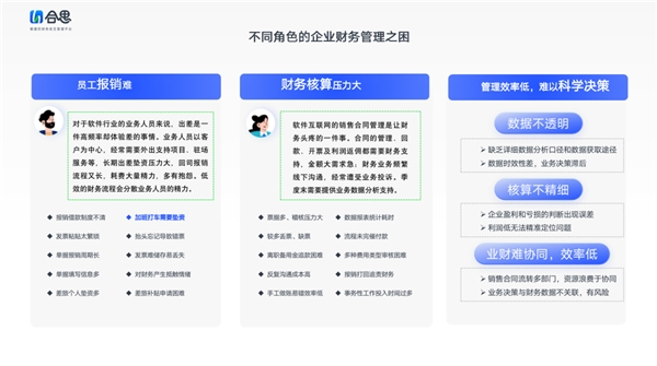 对于软件互联网公司而言,业务、财务、管理者各有各的苦。对于业务人员来说,出差是一件高频率却体验差的事情。业务人员以客户为中心,经常需要外出支持项目、驻场服务等,长期出差垫资压力大,报销流程又长,耗费大量精力,多有抱怨,低效的财务流程会分散业务人员的精力。