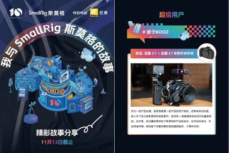 在十周年期间,SmallRig 斯莫格正式启动线上征集活动,邀请全球用户分享与 SmallRig 斯莫格的点滴回忆。活动期间,收集到上百份来自全球用户分享的故事,展现了用户与 SmallRig 斯莫格品牌深厚的情感纽带,更凝聚了无数人对创作的热情与坚持。