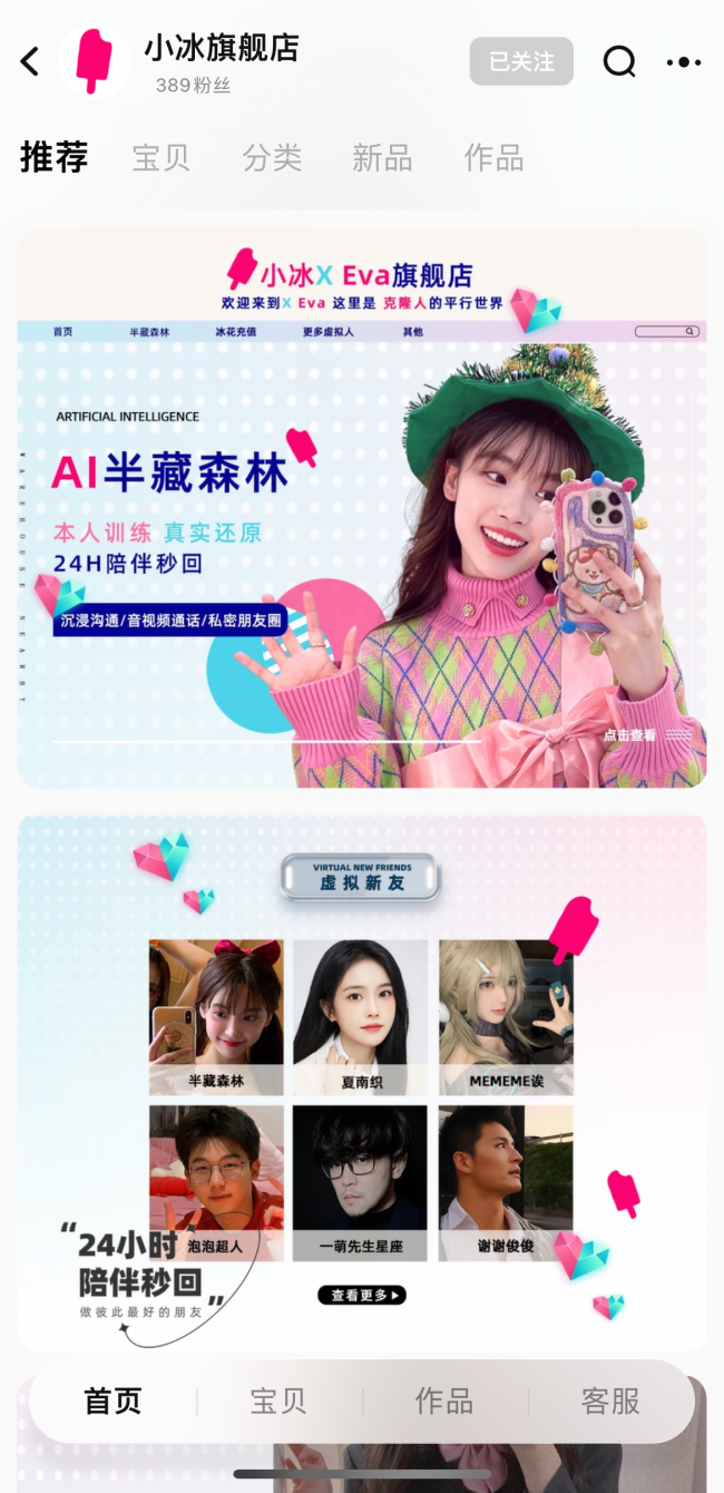 据悉,小冰在淘宝开出了「小冰旗舰店」、以及手淘小程序「X Eva 克隆人的平行世界」,为消费者提供基于 KOL 虚拟人带来的陪伴服务体验。用户搜索「小冰旗舰店」就可以直达店铺进行选购。