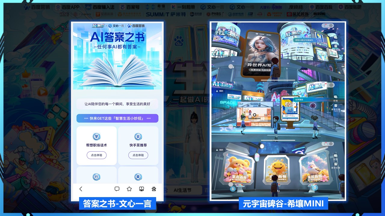 这次百度营销的【AI 生活节】联合百度多条产品线构建 AI 互动场域营销矩阵,为品牌和用户提供更加智能化、沉浸式的体验。百度 APP 主会场上线一系列全新的 AI 体验版块,包括、【答案之书】、【元宇宙碑谷】、【AI 童趣乐园】、【未来映像馆】、【未来城市画廊】、【绘出异次元的你】等,打破了传统营销模式的限制,为品牌和用户之间搭建了更紧密的连接,促进互动与沟通。