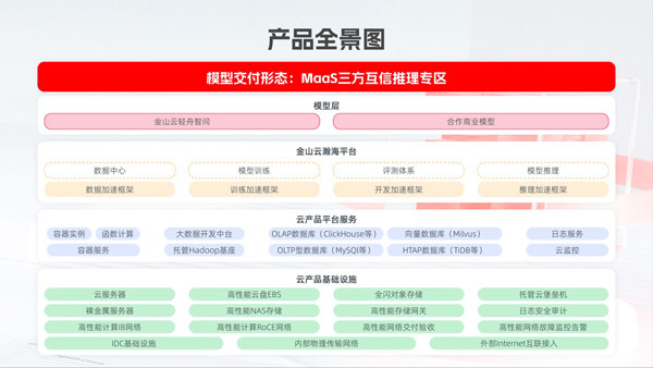 当前,金山云全栈技术体系已形成以云产品基础设施为底座能力,云产品平台服务为核心技术能力,并通过 MaaS 互信推理专区方案和金山云轻舟智问为人工智能客户提供助力。