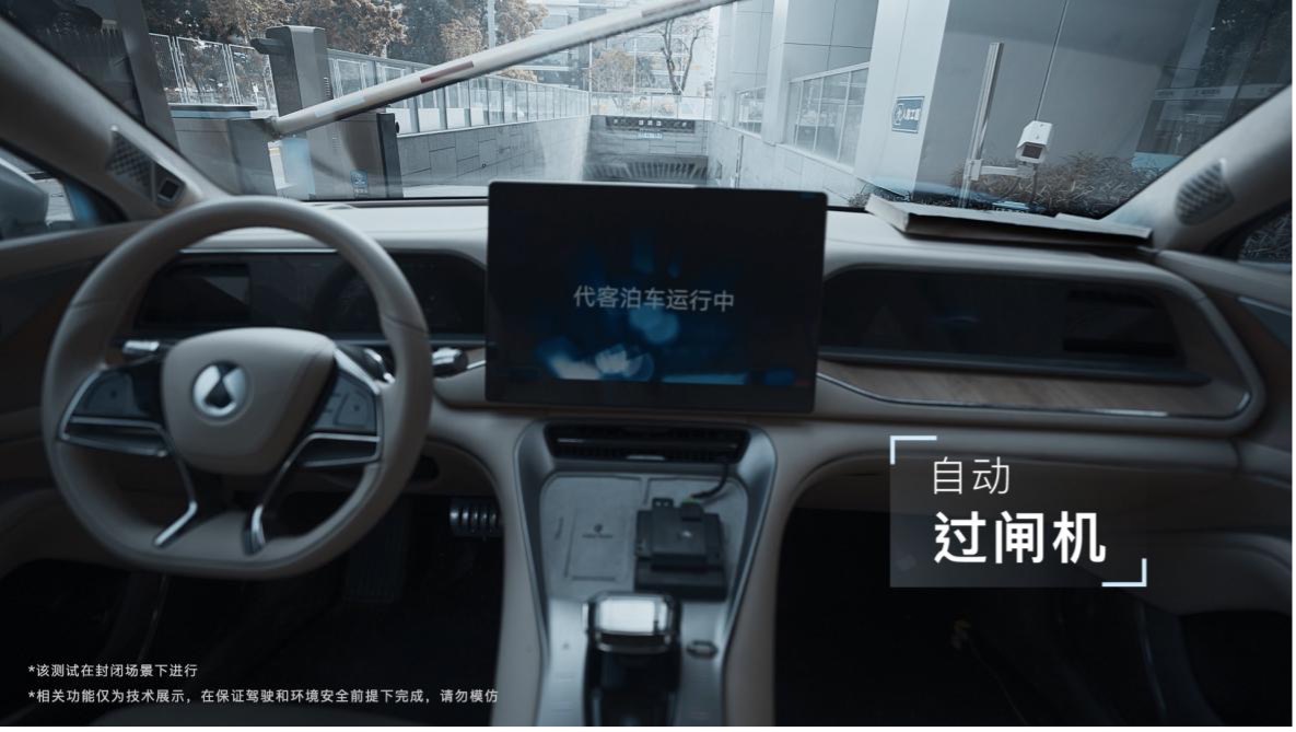 用户开启代客泊车功能后,车辆智能识别路况,在感应到停车场入口闸机时,自动等待闸机识别和录入车牌信息,待闸机抬杆后驶入地下停车场。