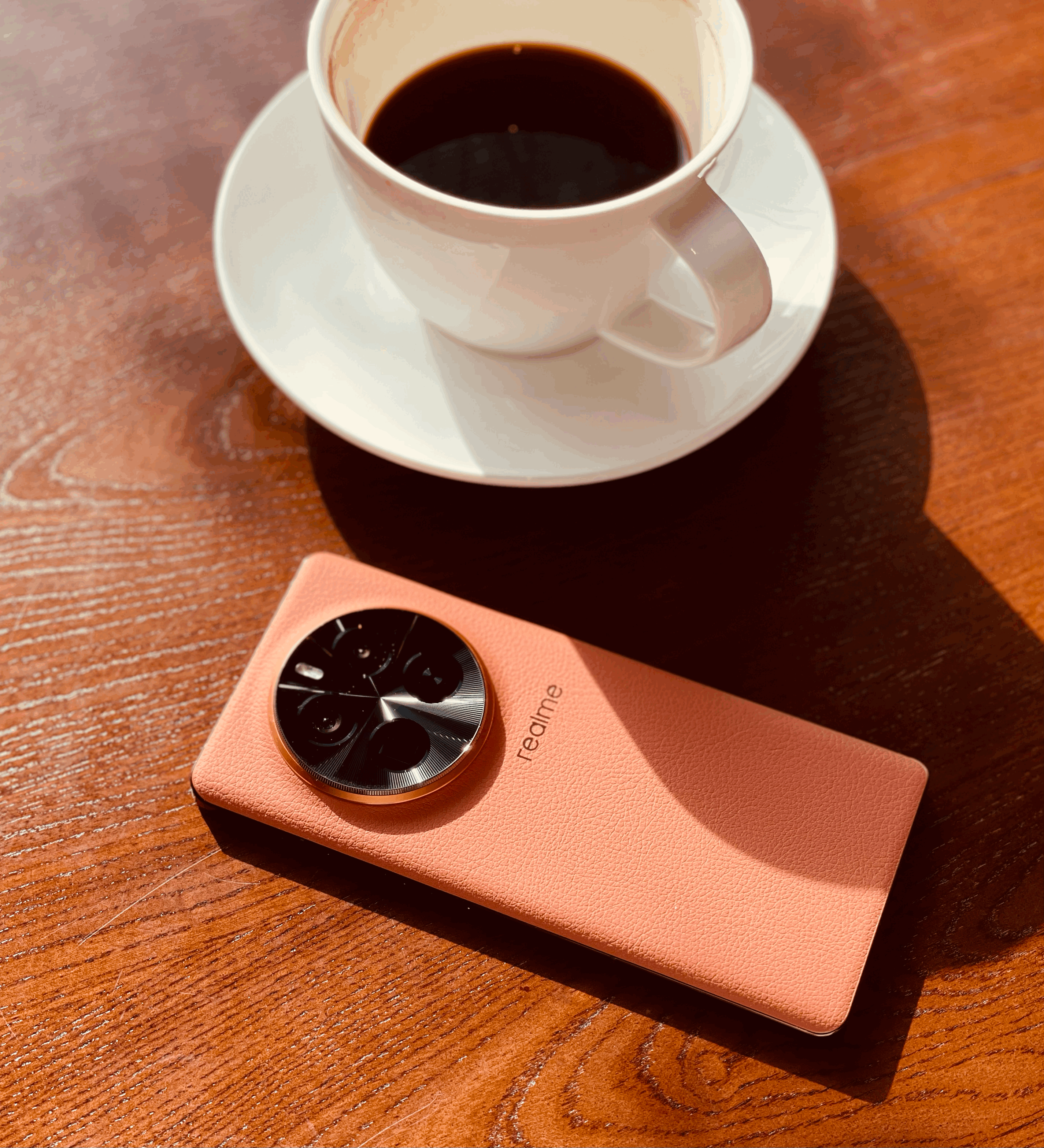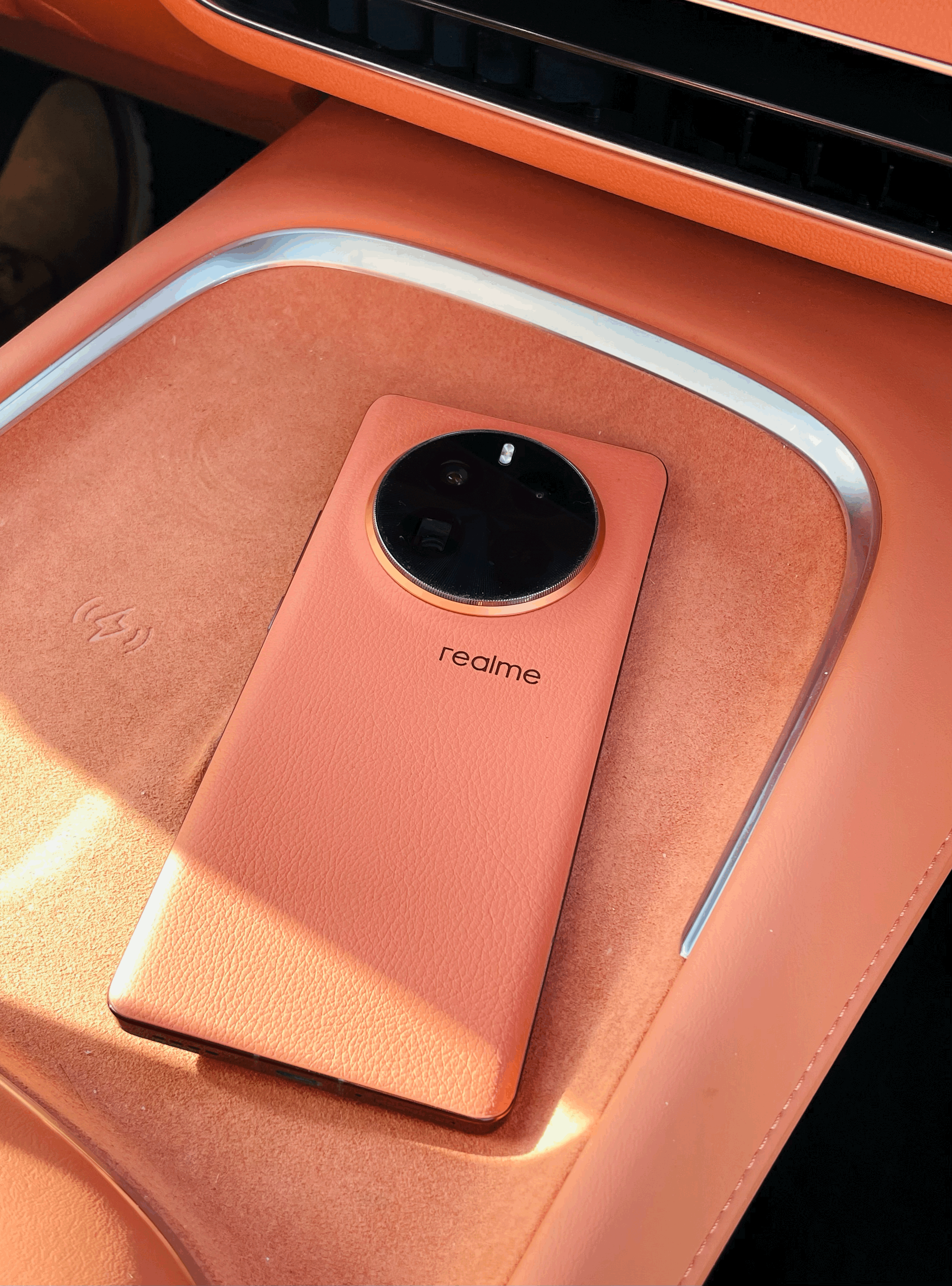 先抛开真我GT5 Pro 正面的屏幕不说,极客公园拿到的是一版「赤岩」配色的顶配机器,略呈暗色的橙红素皮手感相当好,不仅解决了玻璃后盖的「指纹收集器」和「手滑」问题,同时机器背部的圆形镜头模组,再次彰显了这台机器「越级」的野心——今年几乎所有手机的旗舰机型,背部的相机模组,都改成了圆形设计。