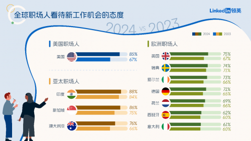 领英最新调研数据显示,2024 年全球职场人跳槽意愿正在显著增加:美国有 85% 的职场人表示想在 2024 年考虑新机会,而去年该数据仅为 67%;欧洲国家中,英国、爱尔兰和德国职场人的跳槽意愿相比去年也有显著提升。同时,领英数据显示,2023 年,求职者的平均职位申请数量也显著提高,例如,美国求职者的职位申请数量比 2022 年提高了 21%,英国求职者则提升了 27%。