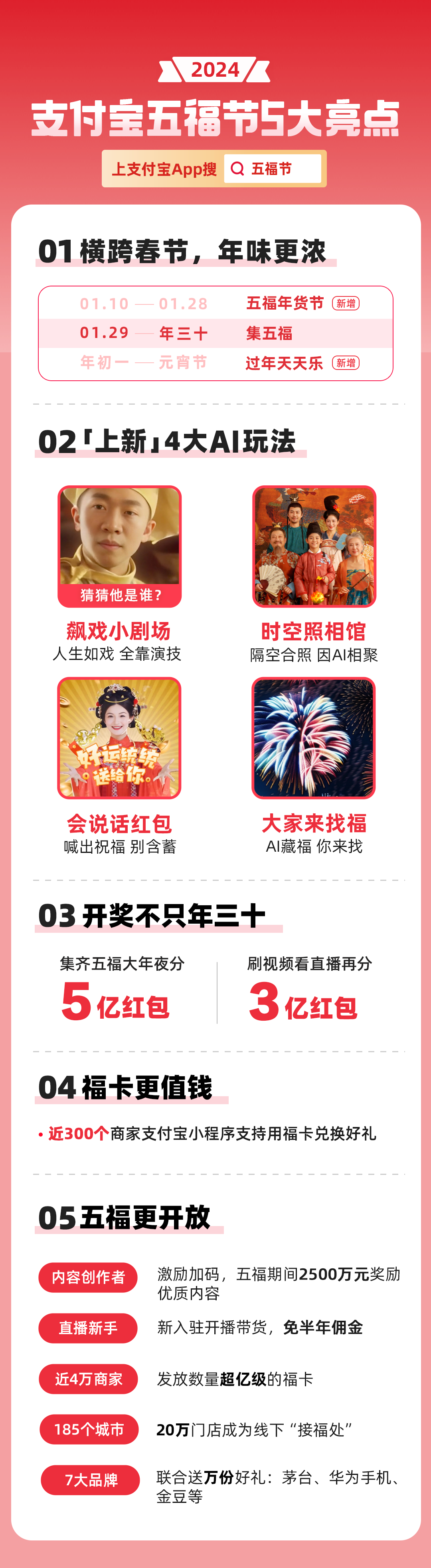 支付宝集五福今日开启,连续 9 年发放亿级红包拉风的极客2024/01/29摘要第 9 年集五福来了!集福分 5 亿、看视频再分 3 亿1 月 29 日,支付宝「集五福」正式开启,除了集福瓜分 5 亿外,看短视频直播还能再分 3 亿红包,用户可上支付宝搜「五福节」参与。「集五福」起始于 2016 年,累计吸引 7 亿用户参与,被称为新「四大年俗」之一,是唯一连续九年发放亿级红包的互联网春节活动。支付宝集五福红包分享至