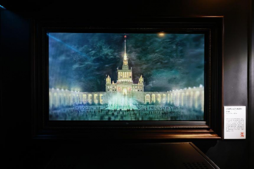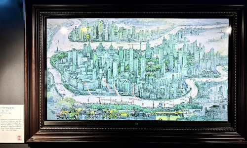 其中, 丁筱芳、丁阳创作的国画作品《一江一河展新貌》以传统青绿山水设色, 以全景视角将上海的「一江一河」和外滩、浦东纳入画面, 以写意和写实相结合的手法, 再现了上海最具代表性的地理和人文景观, 寓意了这座城市的过去和现在, 以及生生不息的海派文化。在现代数字化技术的呈现上, 上海一江一河 (黄浦江、苏州河) 的繁荣景象尽收眼底。