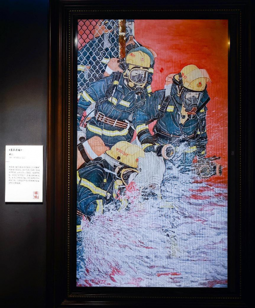 另一幅描绘消防员的画作《勇往直前》在本次巡展过程中也受到了大众喜欢。画家解宇被一则「消防队员为救他人不幸罹难」的新闻深深打动, 进而创作了这幅工笔画表达敬意。画作以倒三角构图, 细腻的笔触, 表现了消防队员们在救火现场的英勇。而为了增加层次感, 画家还增加了二道铁丝网, 以强化消防员不怕困难勇往直前的大无畏精神。