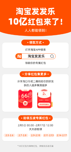 值得奔走相告的是,为了烘托用户春节接好运、阖家欢的氛围,「淘宝 10 亿红包发发乐」活动将贯穿春节全周期,从 2 月 5 日至 17 日 12:00,分开运红包、龙年红包、拜年红包、串门红包、财神红包五波,连发 13 天。