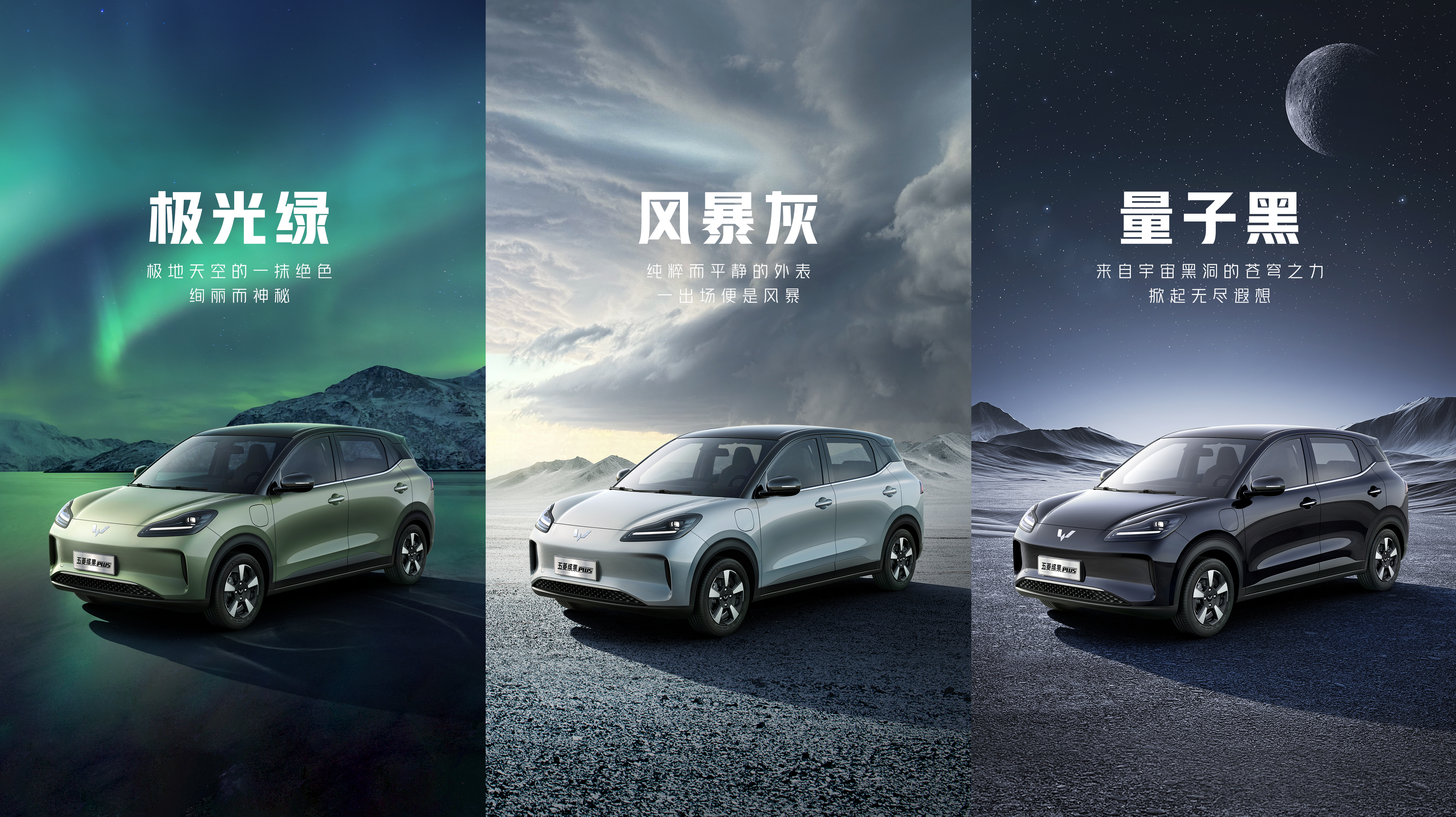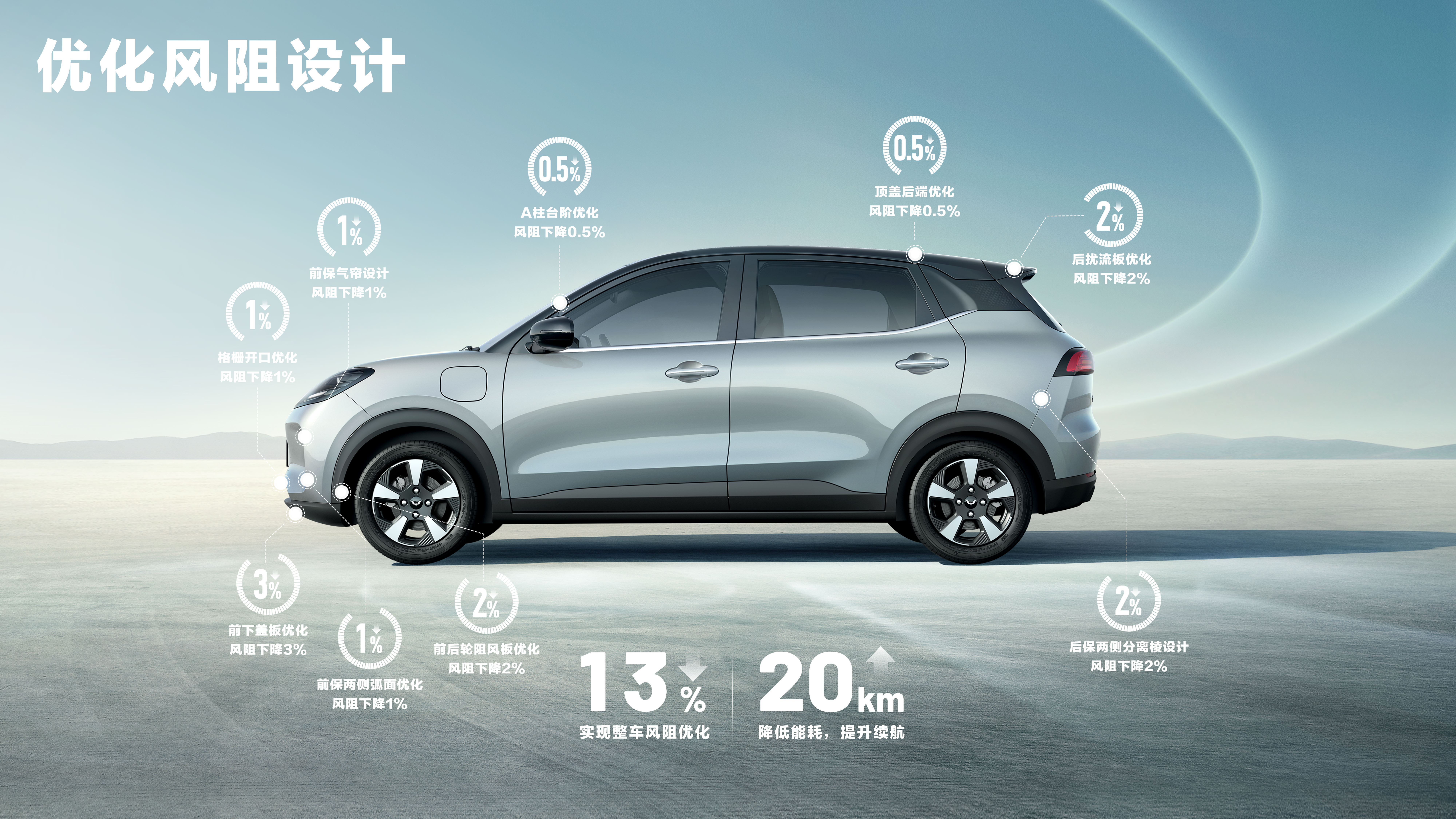 五菱缤果 PLUS 采用驭风能量美学外观设计,凌厉感造型搭配舒畅的车身流线,给人以视觉冲击力,配备风暴灰、极光绿、量子黑 3 款车色,呈现个性风采。大倾角风挡、风刃式前保气帘、铝合金破风轮毂、反翘尾翼等搭配悬浮式分色车顶,一系列低风阻外观设计实现整车风阻优化 13%,降低能耗,续航提升约 20 公里。