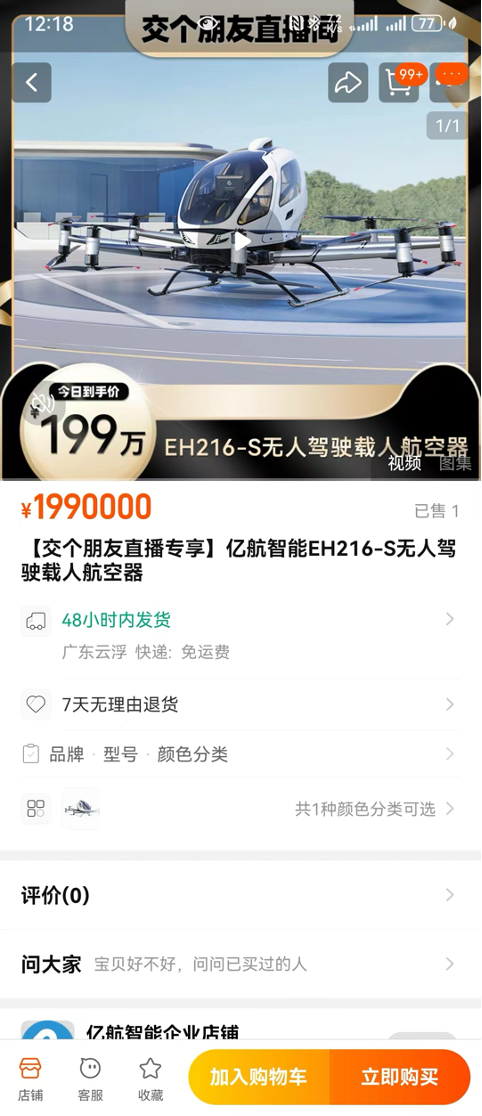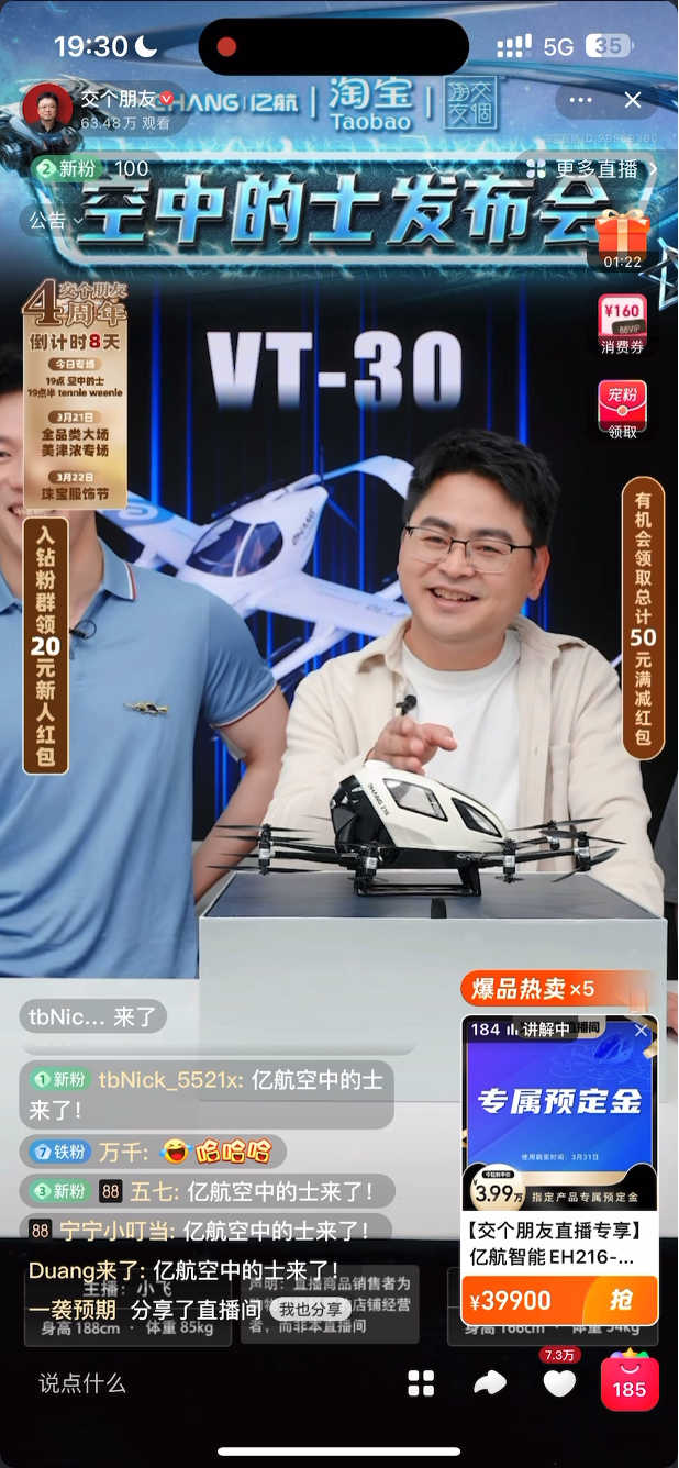 3 月 20 日当晚,全球首个获得适航认证的国产自主研发的「空中的士」无人驾驶载人航空器,在「交个朋友」淘宝直播间亮相。该款商品设置的意向定金为 3.99 万元,「这就是个诚意」,主播崔东升在介绍商品时表示,可以先交付定金再走全额支付。但有买家按耐不住,直接选择了支付全款。