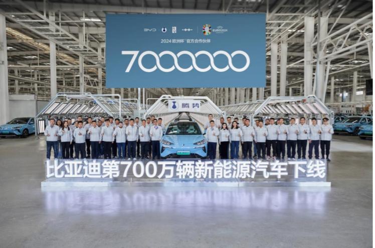 2024 年 3 月 25 日,比亚迪再次刷新纪录,成为全球首家达成第 700 万辆新能源汽车下线的汽车品牌,全新腾势 N7 作为下线车型在济南工厂亮相。