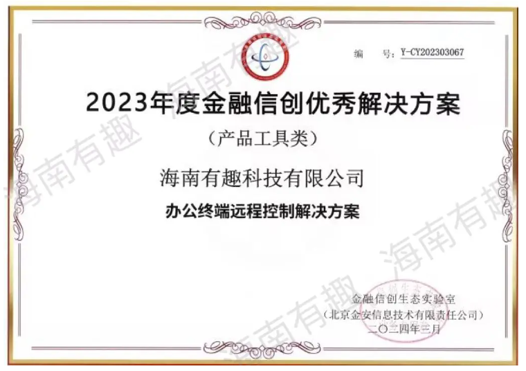 近日,由中国人民银行领导、中国金融电子化集团有限公司牵头组建的金融信创生态实验室发布「2023 年度第三期金融信创优秀解决方案」,海南有趣科技有限公司(上海久尺网络旗下子公司)办公终端远程控制解决方案赫然入选。