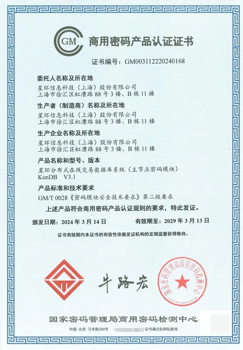 近日,星环科技自主研发的分布式交易型数据库 KunDB 顺利通过了 GM/T 0028《密码模块安全技术要求》安全等级第二级认证,获得了由国家密码管理局商用密码检测中心颁发的《商用密码产品认证证书》,标志着星环科技分布式数据库产品在密码算法的安全性、实现的正确性、密码模块的安全管理及物理安全等方面均达到了国家标准,能够为用户提供更加安全、可靠的数据服务。
