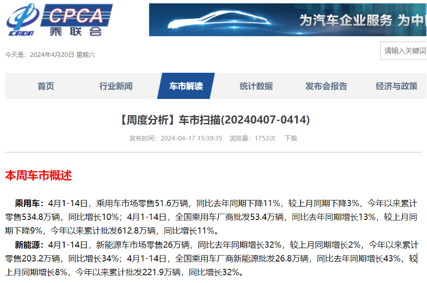 近日,乘联会发布了 4 月 1 日-14 日的全国车市信息,一组数据引发外界关注。