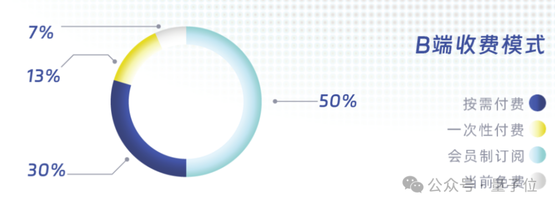 其中 B 端产品从通用场景到垂直赛道分布较均匀,收入模式以会员订阅和按需付费为主,商业模式较为清晰,虽然(纯 B 端)占比只有 31%,但80%以上的产品均实现营收。