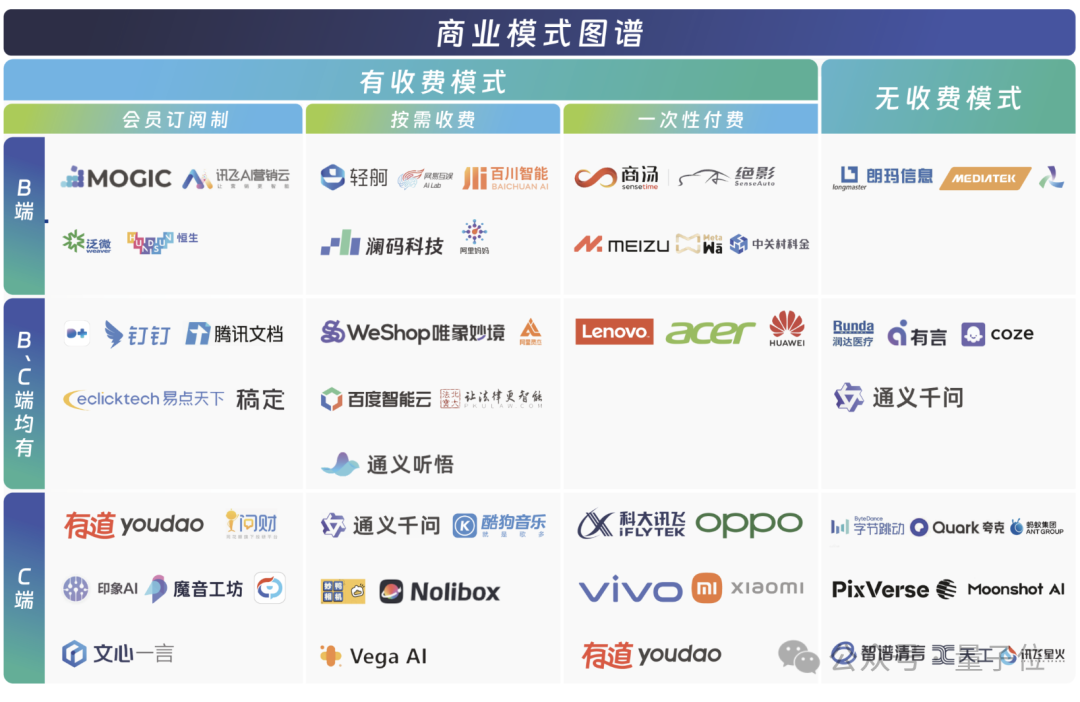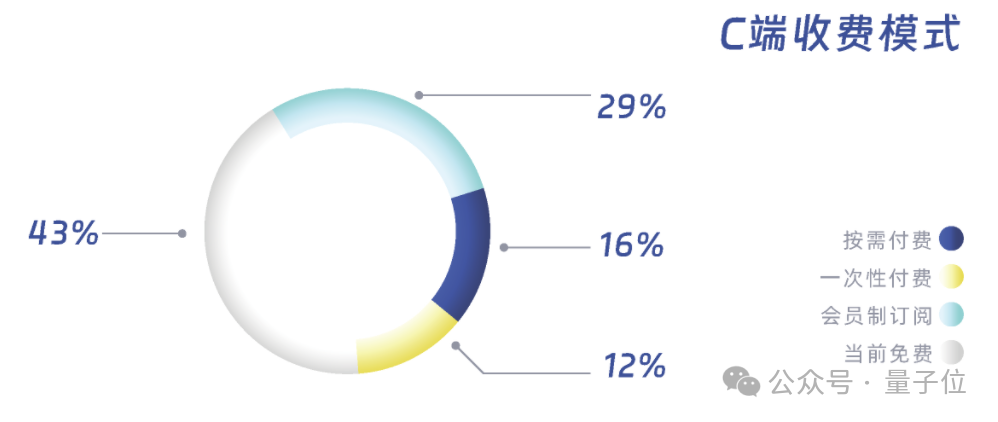 而 C 端产品以智能助手以及图像生成类的生产力工具为主,虽然用户量大(纯 C 端占比 50% 以上),但盈利状况普遍不乐观,近 50% 的产品当前仍未有明确的收入模式,以免费为主。