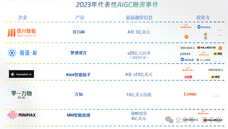 去年,国内 AIGC 圈内一共至少包含 5 起代表性融资事件,其中智谱 AI 凭借智谱清言一年共获得了超过 25 亿元人民币融资,月之暗面的 Kimi 智能助手更是在 A 轮就吸引了超过 10 亿美元。