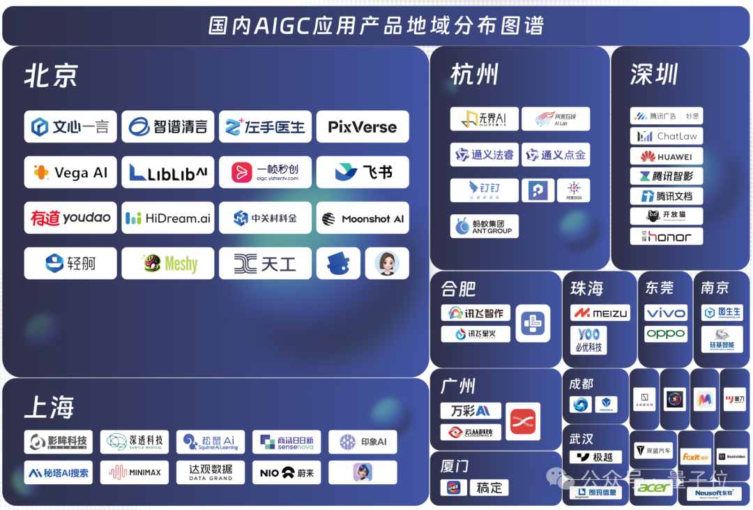 从地域来看,北京、上海、杭州、深圳诞生的 AIGC 应用产品最多。