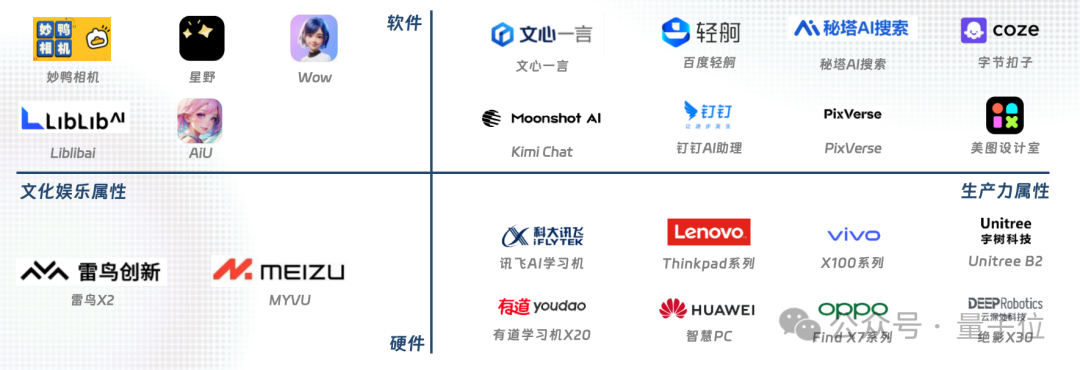 按照作用属性以及软硬件形态,厂商及代表产品划分如下。具备生产力属性的产品占比达95%以上。
