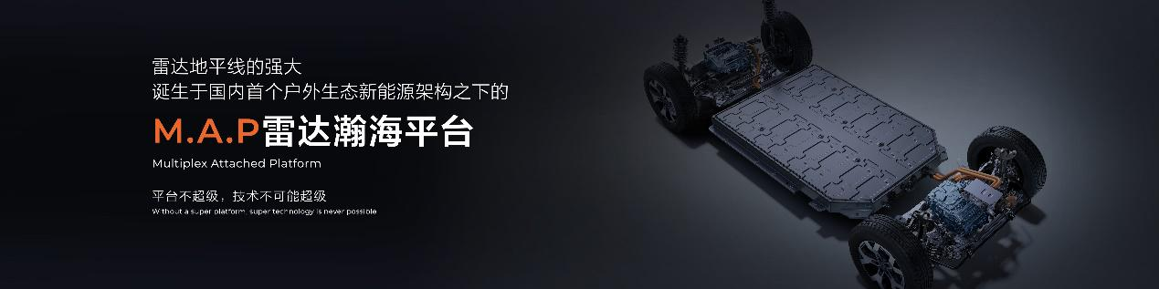 雷达地平线诞生于国内首个户外生态新能源架构之下的 M.A.P 雷达瀚海平台。与其他平台不同,M.A.P 雷达瀚海平台融合顶流的皮卡技术和先进的新能源乘用车技术,让平台上诞生的每一款车,拥有能够全面超越传统皮卡平台的机械性能,和全面赶超先进新能源平台的电特性。该平台不止是产品平台、技术平台,还是多元户外生态平台,是雷达构建户外生态最重要的支点,也是超级与不超级的分界点。